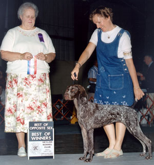As of 5 September 2000, Tara already had racked up 8 show points, including a major and several BOS. She is Narnia's first GSP and is handled both by her breeder, Peggy Roush and Jane Jorgenson in regular competition, and by Dayna Jorgenson in Juniors. Tara earned a fourth place in her futurity at the German Shorthair Pointer Club of America's National Specialty this spring when she was just 7 months old -- out of a class of 18. She is anticipating her first shot at a Junior Hunter title this fall (2000), with Dan Jorgenson as her handler.